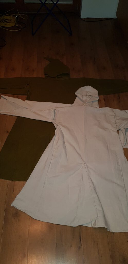 Allerdings wollte ich den Soff nicht planlos zerschneiden. Ich begann damit das Gewand aus handgewebtem Bauernleinen zurechtzuschneiden und zusammenzuheften. Als Maßvorlage diente das Buch von Katrin Kania über historische Gewänder. Am Ergebniss konnte man den Faltenwurf und die Passform mit der Quelle vergleichen.
