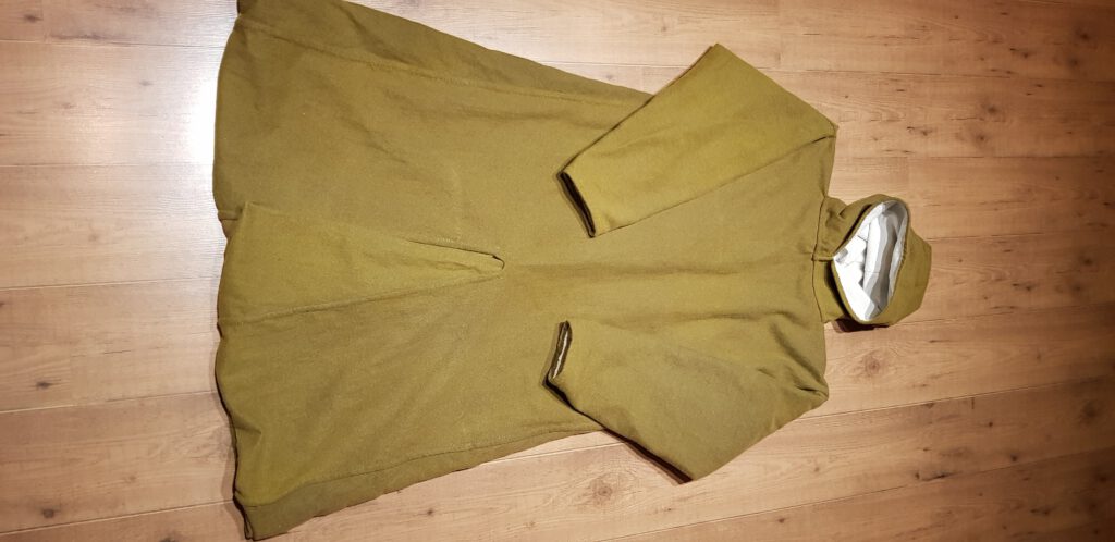 Nach dem Ausschneiden mit ein wenig Nahtzugabe (Wollnähte sind Dicker als Leinennähte) ging es an das Zusammennähen. Das Bauernleinen war natürlich nicht sinnlos zerschnitten. Es diente ebenfalls als Futter. Das Ergebnis seht ihr hier: