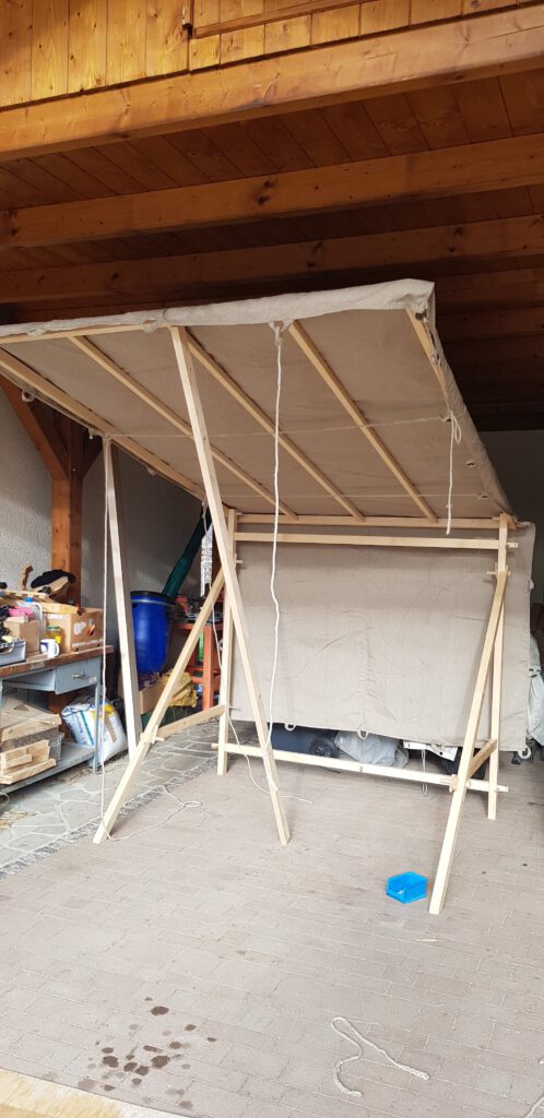 Wir wollten wieder ein Dach aus Leinenstoff. Der hat allerdings den Nachteil, dass er nur ab einem Winkel von 45 Grad das Wasser ableitet. Das mussten wir auf mehreren Märkten mit unserem ersten Stand bei Regen lernen. Dabei steht das in jeder guten Zeltbeschreibung.