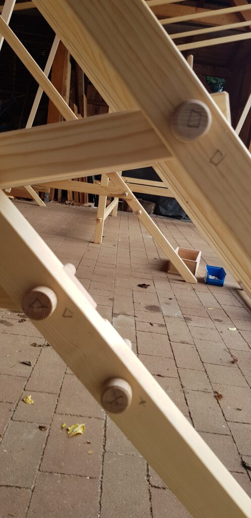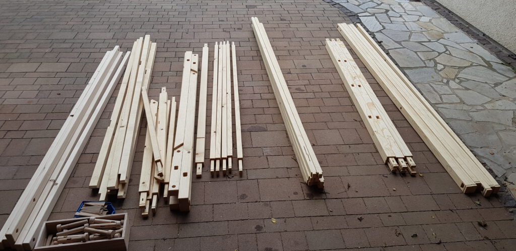 Das Holzgestell war zügig zugeschnitten und die Zapfen und Löcher schnell geschnitten und gestemmt. Bolzen konnten auch relativ einfach gedrechselt werden.